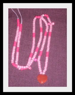 I have made the necklace with contrasting purple suede lacing , 2 different shades of pink plastic beads, 4 pink jingle bells and a large gorgeous pink/cherry quartz heart crystal.