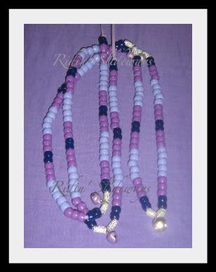 This fun necklace brought out the peace loving hippy in me it is made on purple suede with contrasting shades of purples with blue beads to make it pop, 4 purple jingle bells and a larger silver jingle bell up front.